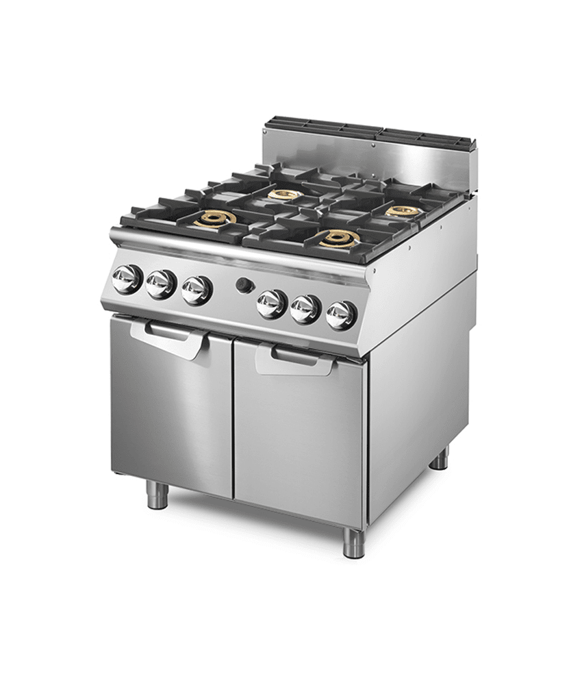 Fogão a gás de alto rendimento com 4 queimadores (2x 6kW + 2x 16kW) e base neutra com portas.