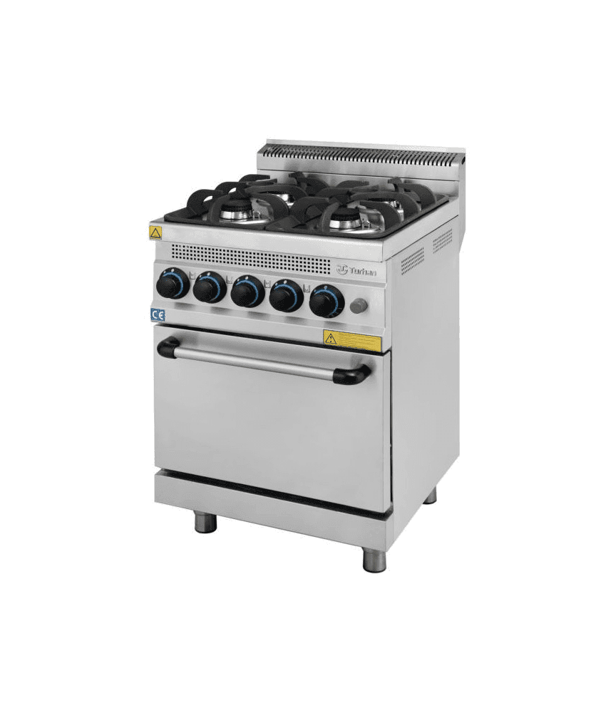 Fogão a gás com 4 queimadores e forno para bandejas GN1/1.Forno com isolamento térmico, de fácil limpeza e pés reguláveis.