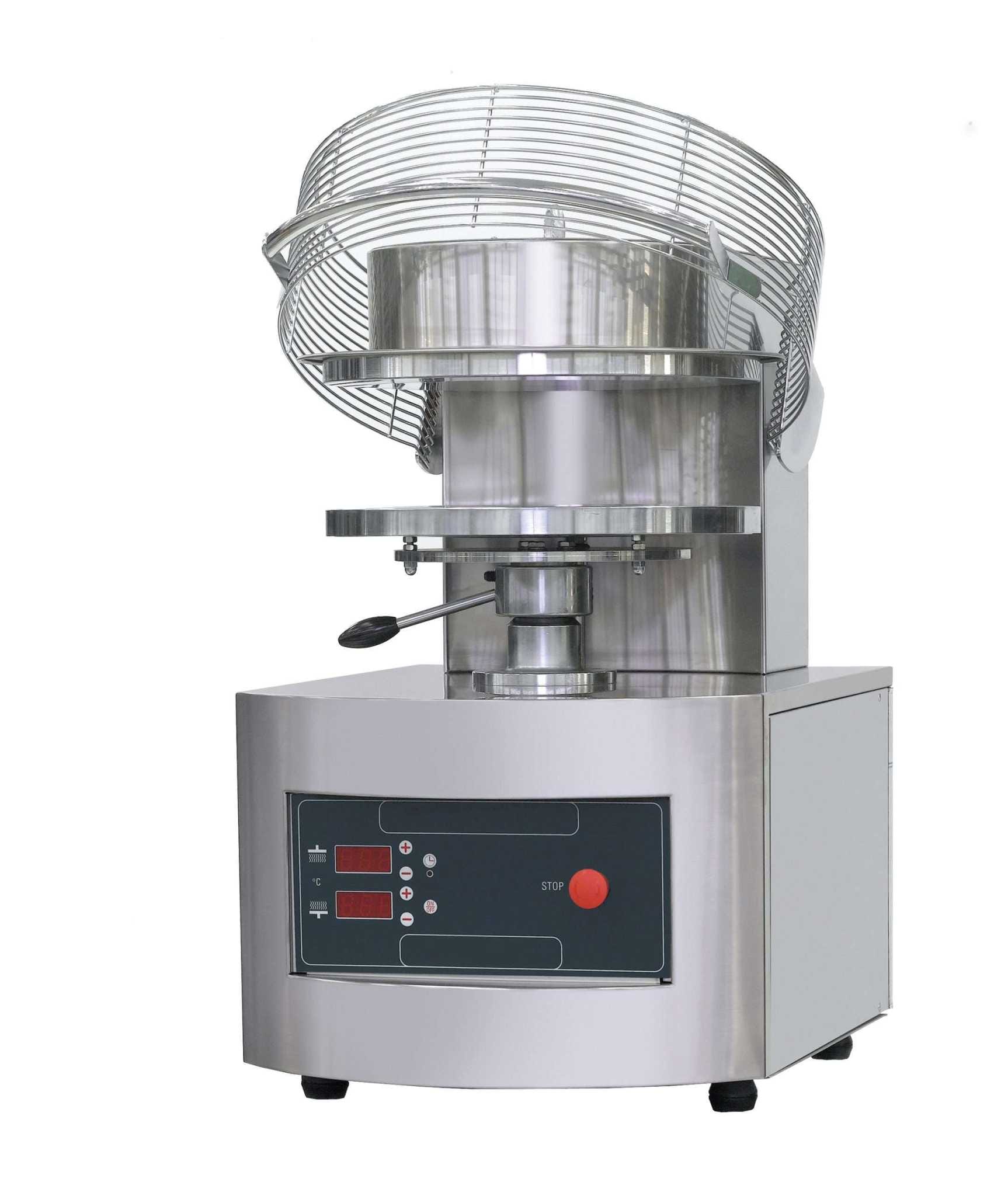 Prensa especial, projetada exclusivamente para achatar e pré-cozinhar ligeiramente as pizzas, até um diâmetro máximo de 520 mm.