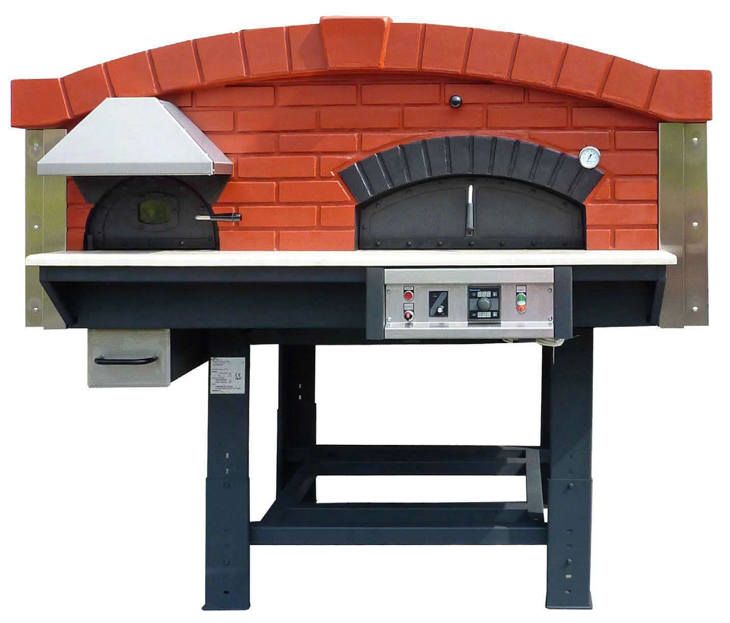 Forno pizza madeira/gás com duas portas frontais; Câmaras madeira/gas estão separadas da superficie de cozedura; Câmara madeira com gaveta para recolher cinzas; Câmara gás com queimador ecológico, funciona com os diversos gases.