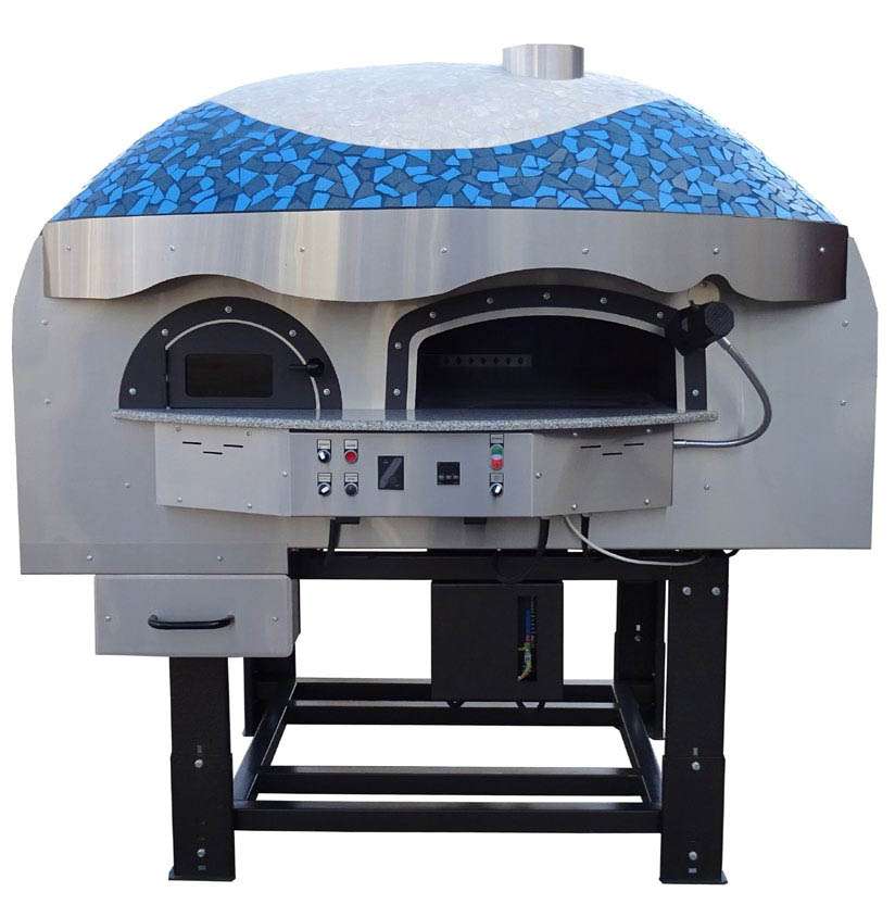 Forno pizza madeira/gás com duas portas frontais numa base rotativa; As câmaras de madeira/gasestão separadas da superficie de cozedura; Câmara de madeira com gaveta para recolher cinzas; Camara de gás, com queimador ecológico, funciona com os diversos gases.