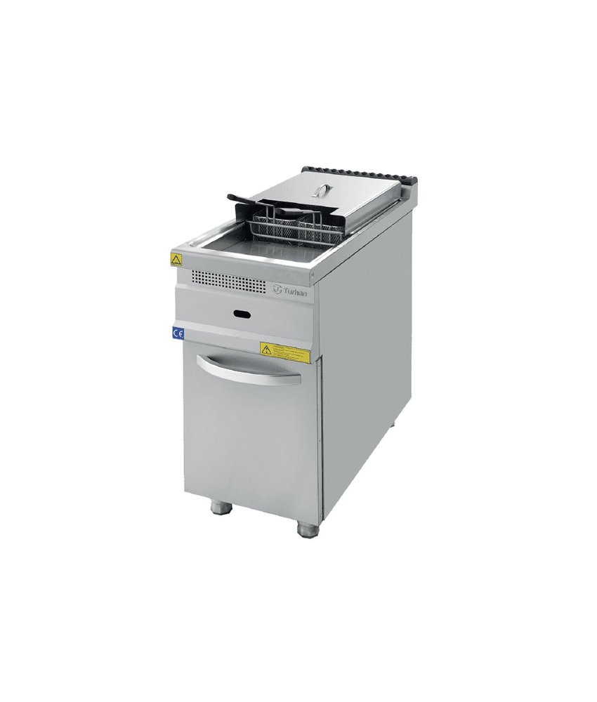 Fritadeira elétrica com 1 cuba de capacidade 24lts, base suporte com pés niveladores, porta e puxador.