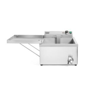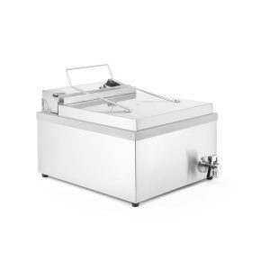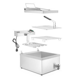 Totalmente em aço inoxidável, é fornecida com duas grelhas de fritar (354 x 383 mm) com cabo frio ao toque, uma proteção contra o calor e uma tampa que também serve de tabuleiro escorredor.