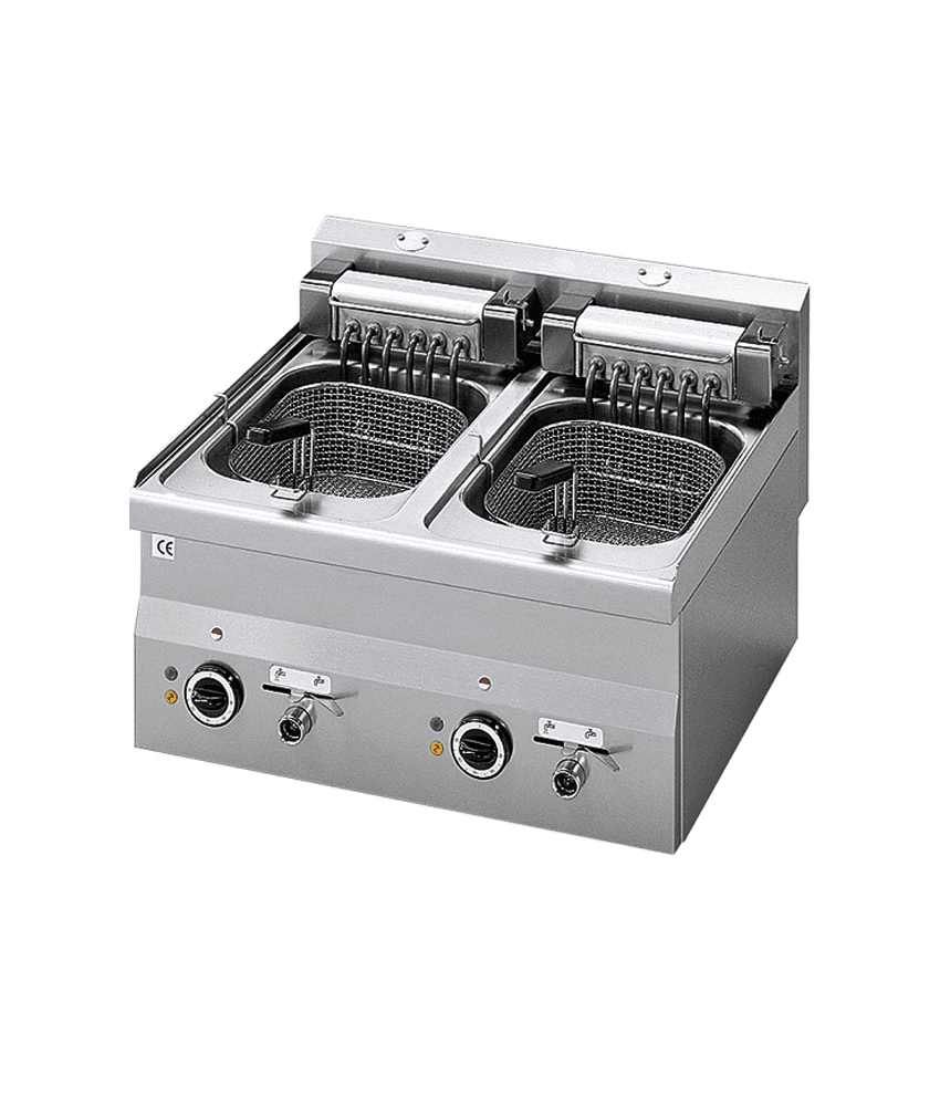 Fritadeira elétrica de bancada com 2 cubas.