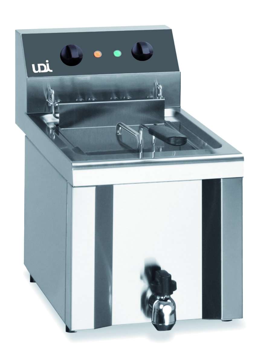 As fritadeiras têm plano de trabalho em aço inoxidável. As cestas são em aço cromado, com alça atermínica. Cubas com zona fria para aumentar a vida do óleo. Controle termostatos e termostatos de segurança.
