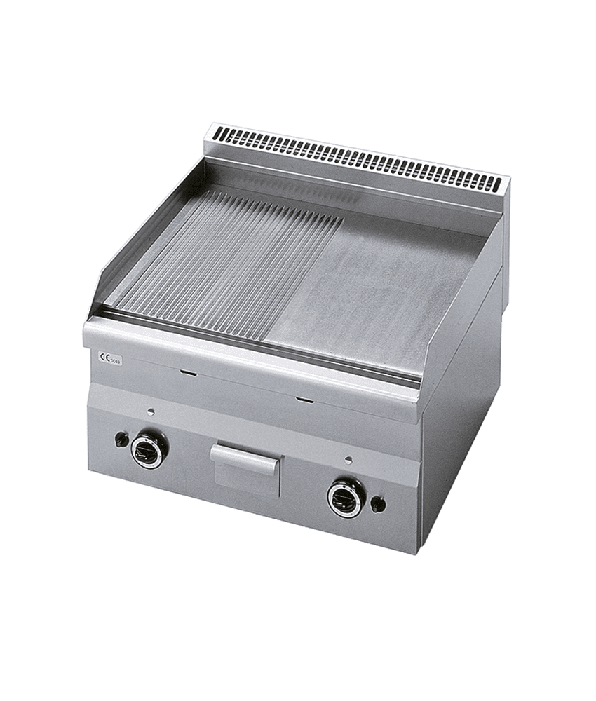 Fry Top de bancada a gás com 1/2 placa lisa e 1/2 placa nervurada.