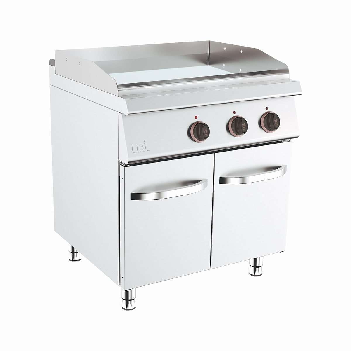 Versão lisa da superfície de cozedura em cromoduro Frytop com armário inferior com porta Frytop com 15 mm de espessura em aço st 52 Área da superfície de cozimento em aço inoxidável com espessura de 3mm Gaveta coletora de gordura em aço inoxidável dentro do armário Superfície de cozimento com inclinação leve para facilitar a limpeza Orifício para escoamento de líquidos Recipiente de óleo residual Sistema de segurança termopar ligado ao queimador Queimadores com acionamento piezoelétrico Temperatura operacional (50-300°C)