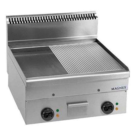 Placa de grande espessura em aço especial de elevada condutividade térmica; molheira de gaveta em aço inox.