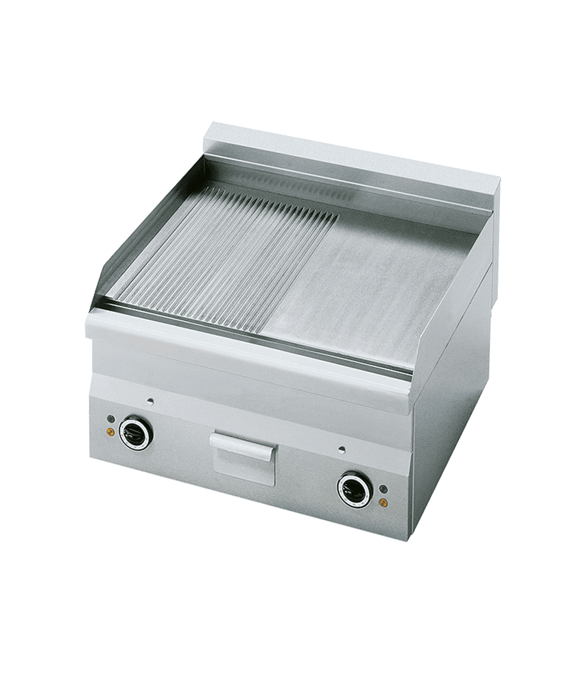 Fry Top de bancada elétrico com 1/2 placa lisa e 1/2 placa nervurada.