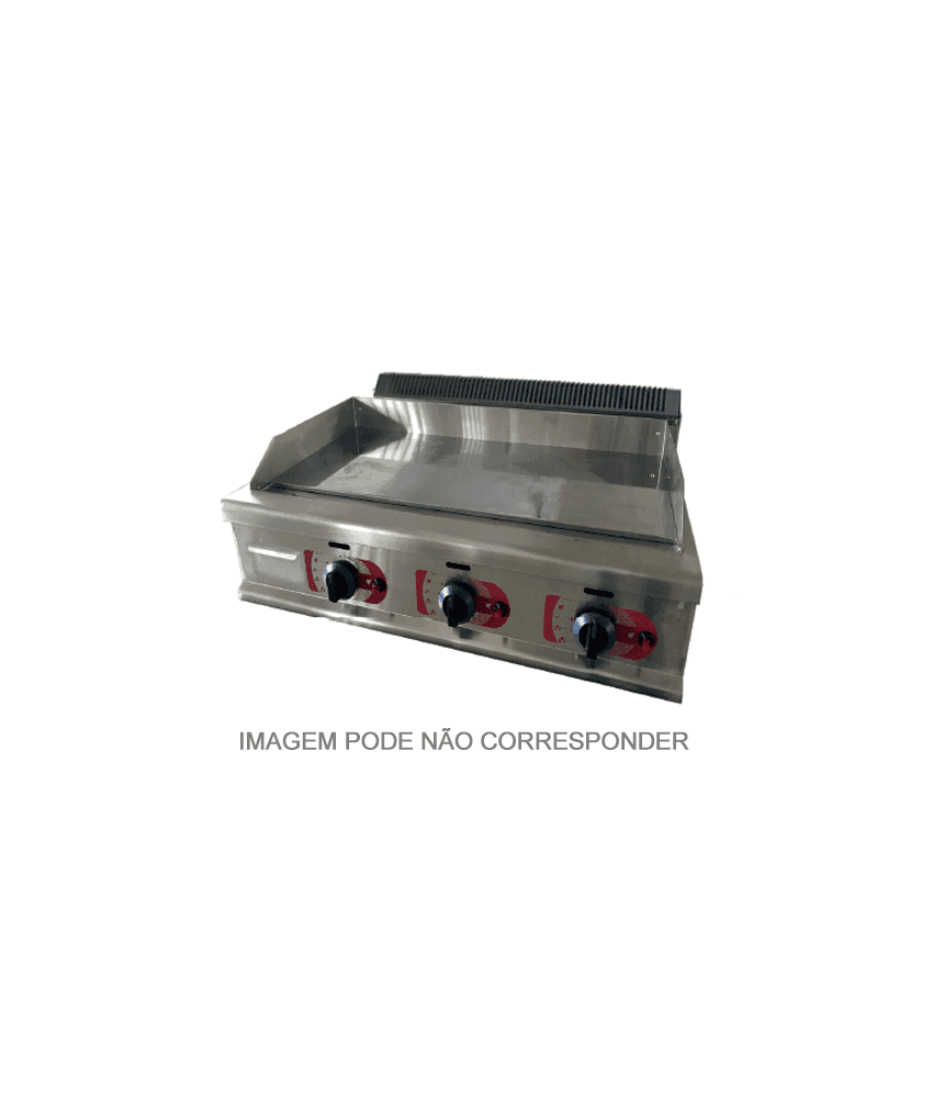 Fry-Top a gás de bancada com placa lisa, com estrutura em aço inoxidável e placa em ferro.