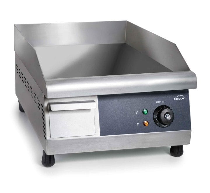 Grill profissional de aço inoxidável com chapa lisa de aço laminado e rectificado, para um aquecimento uniforme durante o cozinhado.