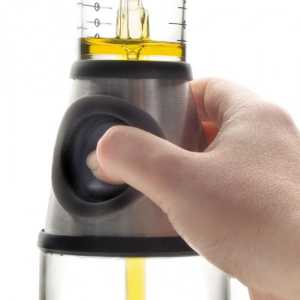 Dosador de óleo com o medidor fabricado em vidro e aço inoxidável. Ao pressionar o botão o óleo sobe até o medidor e você está pronto para dosar a quantidade desejada. Medidas: 7,8×23 cm Capacidade: 250 ml.