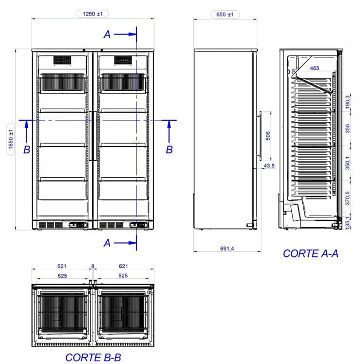 Com duas portas Seis prateleiras planas e duas prateleiras inclinadas em varão plastificado preto, o que lhe confere uma capacidade para 144 garrafas de 0,75cl