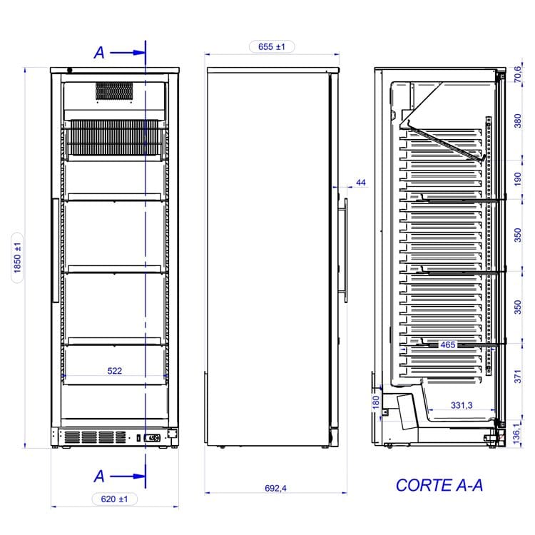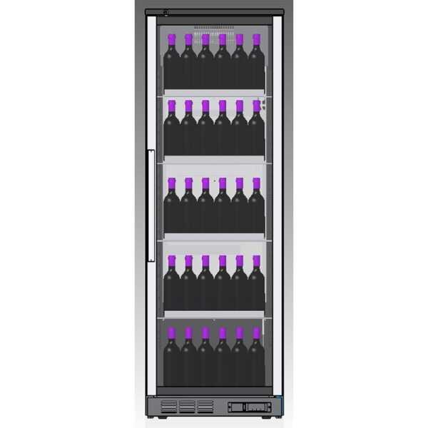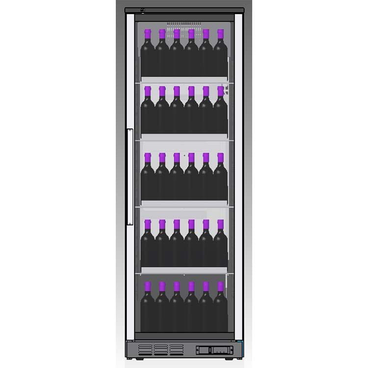 Tem uma porta e está equipado com três prateleiras planas e uma prateleira inclinada de varão revestido a plástico preto, o que lhe dá uma capacidade para 72 garrafas de 0,75cl