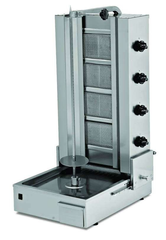 Máquina de gyros a gás, com motor na parte superior do equipamento, estrutura em aço inox AISI304, de fácil manuseamento, rotação do espeto nos dois sentidos, espeto regulável, válvula de segurança magnética.