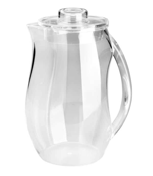 Jarro de 2,8 litros, com tampa fabricado em plástico acrílico transparente apto para alimentação livre de odores e sabores.
