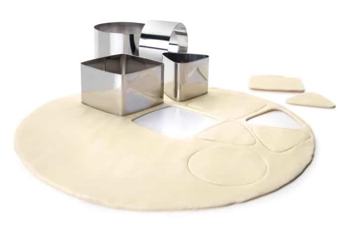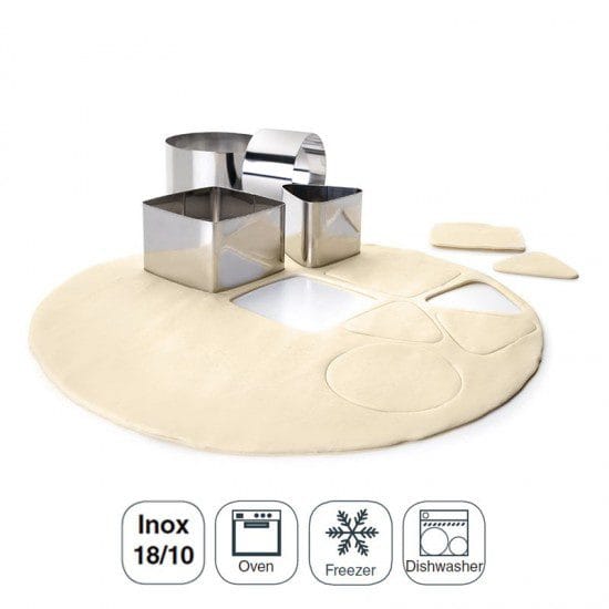 Set de 4 anéis com formas variadas, 2 redondos, 1 quadrado e 1 triangular. Ideal para trabalhos de pastelaria e corte da massa.