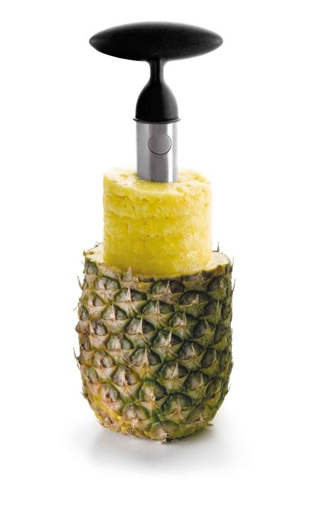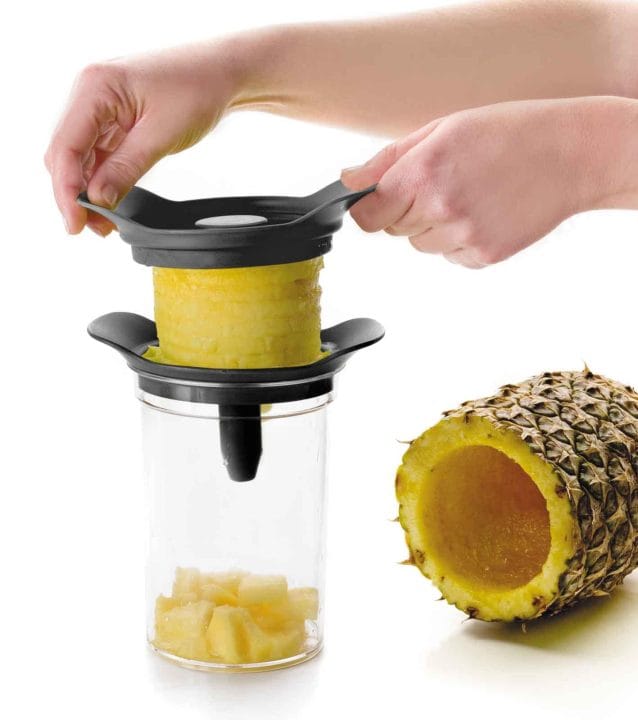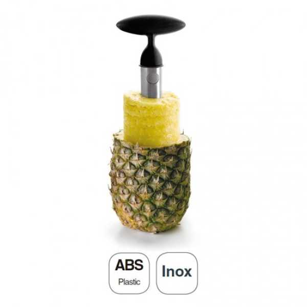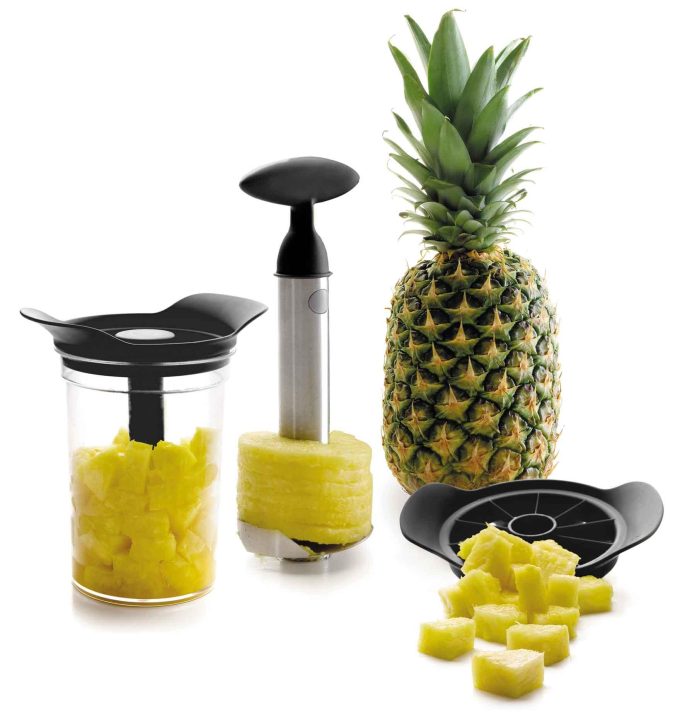 Conjunto 3 em 1 fabricado em aço inox e ABS com um descascador de abacaxi, um cortador com recipiente e uma base empujadora ou para apresentação.