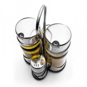 Jogo de galheteiro e de óleos de 175 ml cada um, mas saleiro e pimenteiro de 37,5 ml cada um, fabricado em aço inoxidável e vidro.