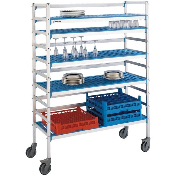 Carrinho com múltiplas aplicações: serviço e recolha de louça, transporte de artigos de cozinha, armazenamento e transporte de utensílios de cozinha, recolha e desclassificação de cantinas colectivas ou de self-service, armazenamento de cestos de louça com artigos de vidro, etc.