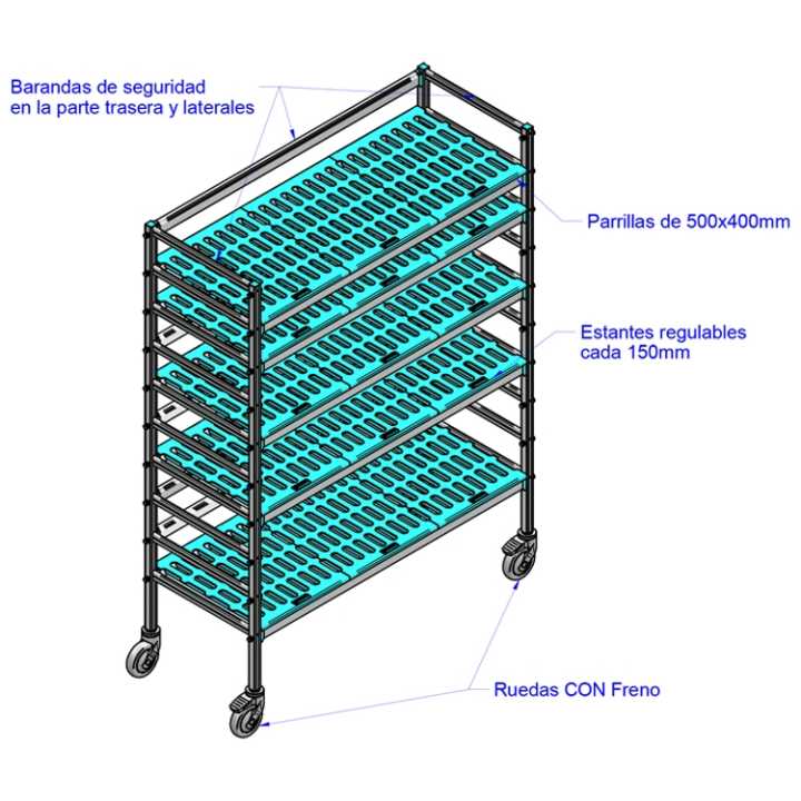 Estrutura de alumínio anodizado com prateleiras de polietileno de qualidade alimentar.