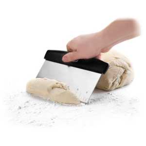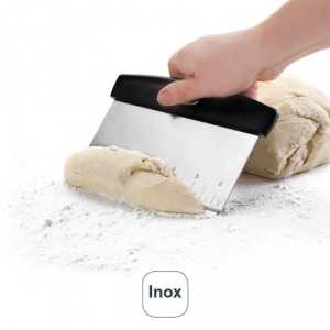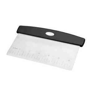 Lâmina de aço inox para manipulação de massas de pães ou bolos. Borda gravado com escala de medida. Tamanho: 16,5 x 11 cm