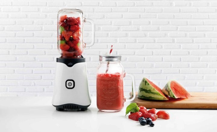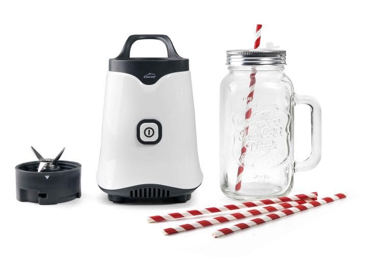 Liquidificador modelo Mix & Go com jarra de vidro e 4 lâminas de aço inoxidável ideal para a preparação de batidos, sumos, triturar gelo, frutos secos…