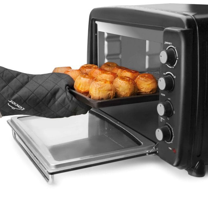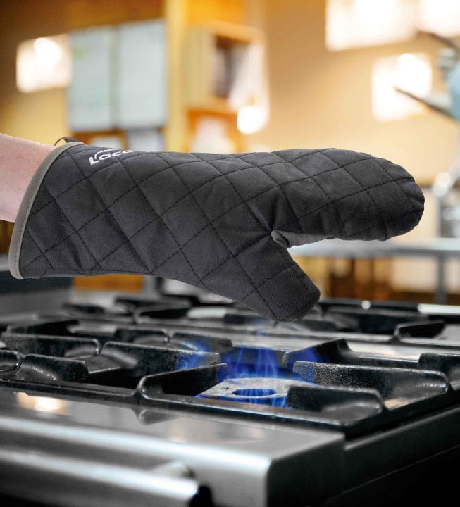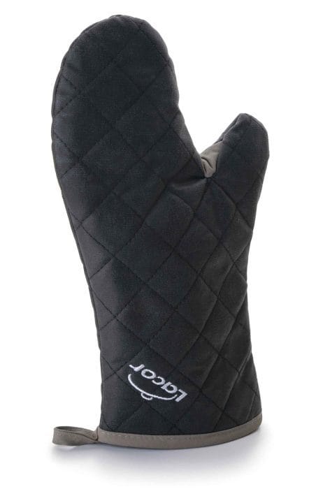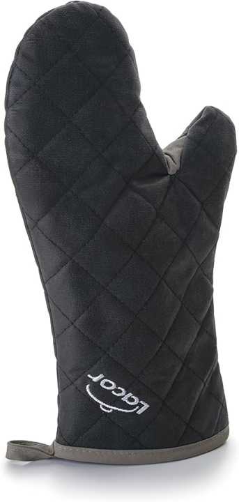 Luva de cozinha fabricado em algodão chama com propriedades auto-extinguivel para proteger as mãos de possíveis queimaduras. Proteção por até 300 ° C. Medida: 36 cm