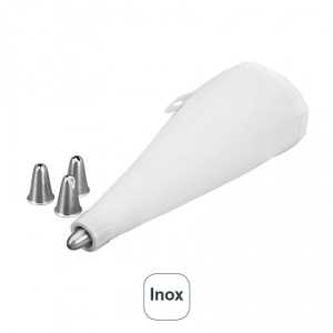 Saco de confeitar de 20 cm de comprimento, com 4 bicos intercambiáveis de 20×30 mm de diâmetro fabricadas em aço inoxidável de grande qualidade.