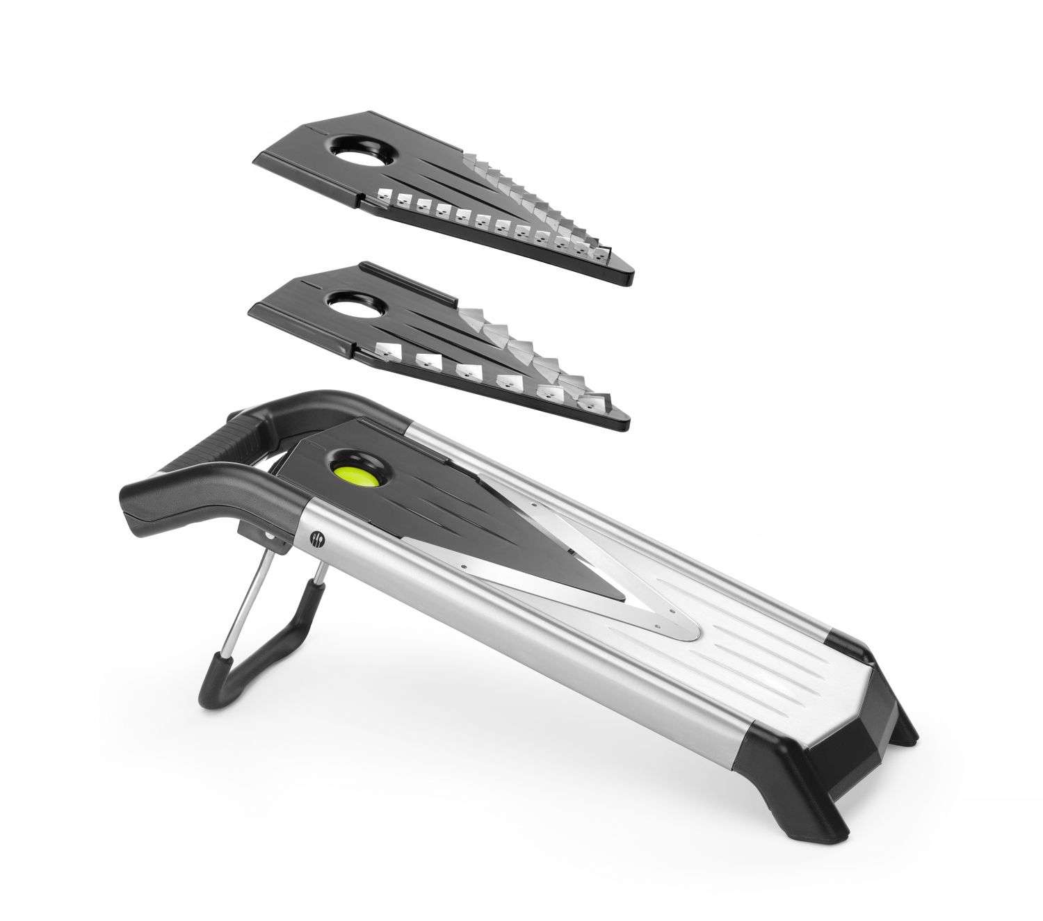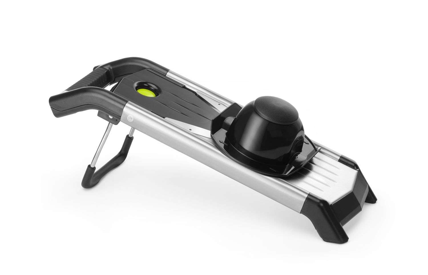 Suporte dobrável integrado – pé largo antiderrapante coberto com borracha; a mandolina pode ser usada segurando-a com as mãos ou colocada numa bancada.