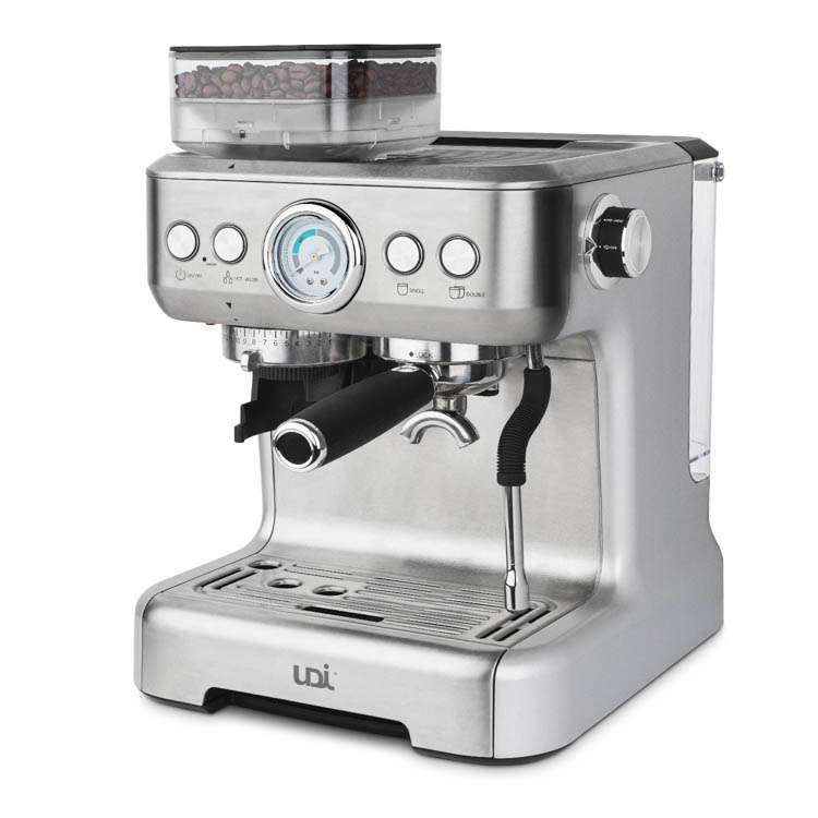 Elegante design de aço inoxidável e estilo retro. Ampla gama de acessórios incluída. Inclui: 2 filtros de aço inoxidável simples e duplos, 2 filtros pressurizados de aço inoxidável simples e duplos, colher medidora e calcador de café.