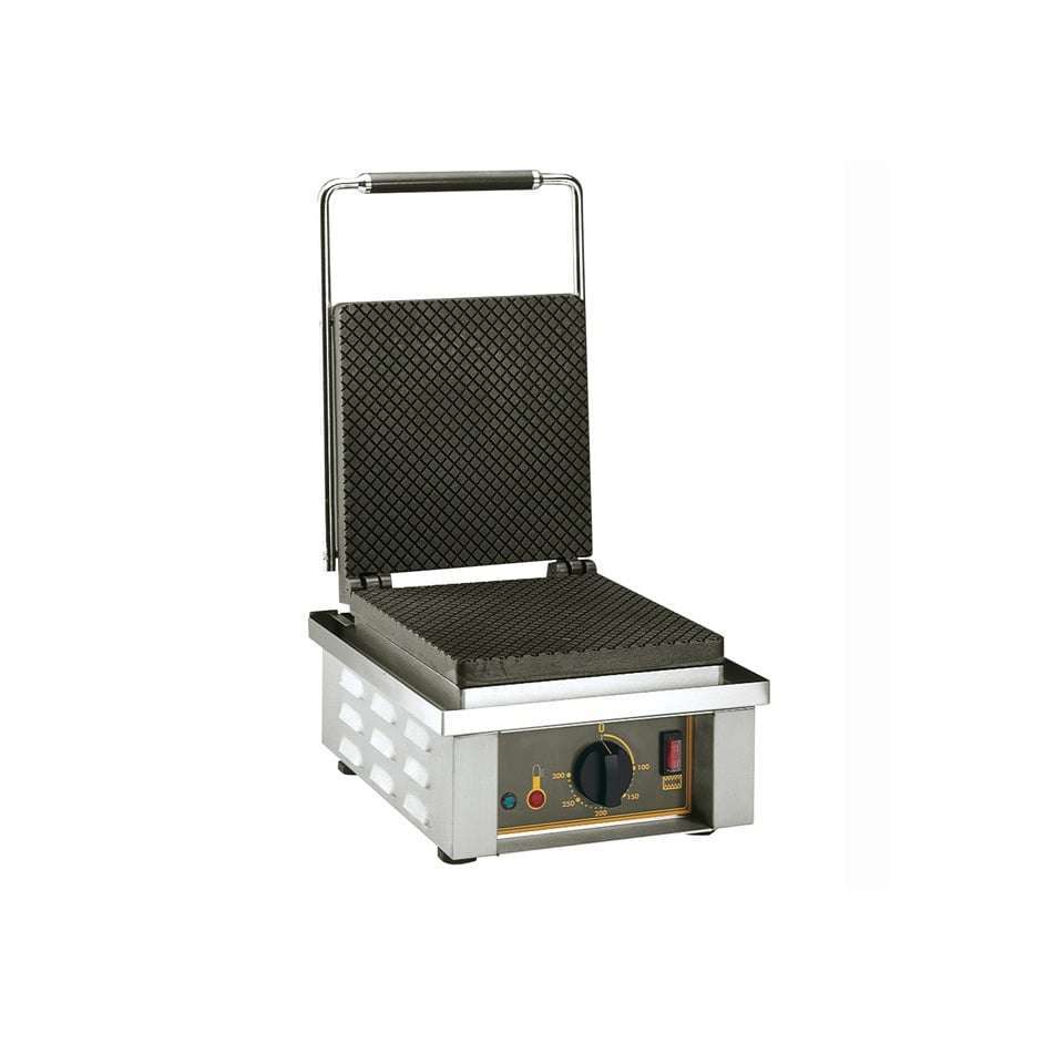 Esta máquina de waffles está equipada com placas de ferro fundido altamente condutoras, o que permite uma distribuição uniforme do calor, e permite a obtenção de waffles bem douradas e crocantes em apenas 2´30 segundos. Uma bandeja removível de fundo recupera o excesso de massa para facilitar a limpeza.