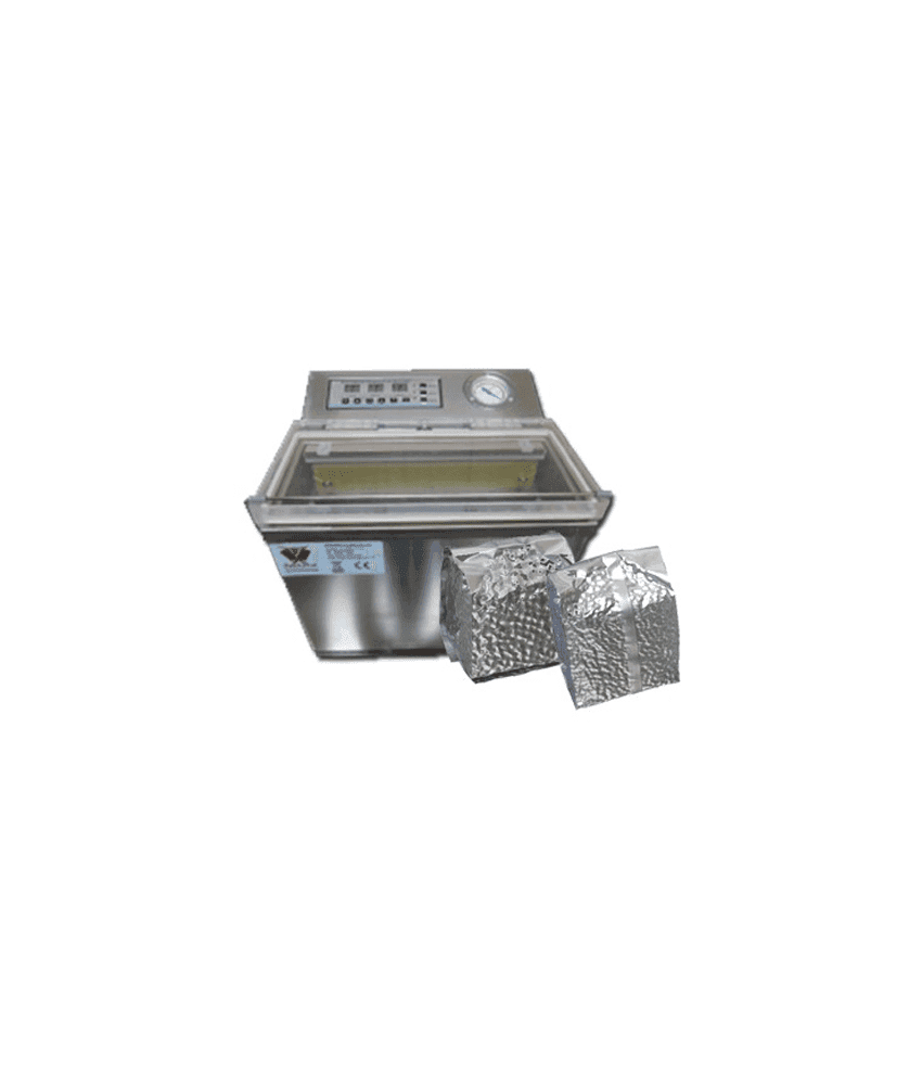 Máquina embaladora a vácuo vertical que permite prolongar o tempo de conservação dos alimentos crus ou cozinhados, sem perda do peso, sem ficarem ressequidos, nem misturarem sabores e odores. Equipamento de chão com 4 rodas para fácil movimentação.