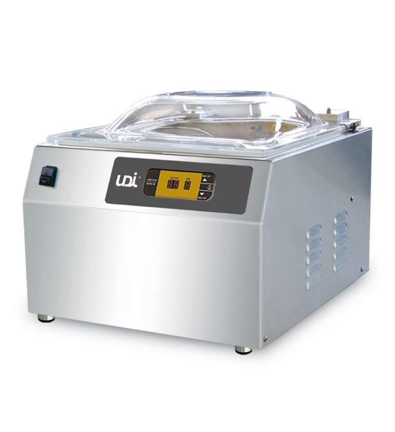 A reentrada de ar por etapas evita danificar alimentos moles ou com texturas mais sensíveis. Possibilidade de selagem com atmosfera modificada através da adição de gás, permitindo o embalamento de produtos que possam ser danificados por compressão no processo normal. Bomba de vácuo com sistema de autolimpeza. Contador de ciclos. Painel de comandos digital. Programa especial para marinar carne e peixe.