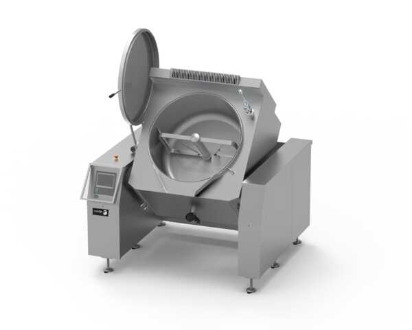 – Fundo do recipiente em aço inoxidável AISI 316 lúcido, apto para produtos particularmente ácidos, com espessura de 20/10 a 40/10. – Paredes da cuba de cocção em aço inoxidável AISI 304 com espessuras de 20/10 a 25/10. – Parede dupla com fundo e paredes de aço inoxidável AISI 304. – Orifício de descarga da cuba com filtro extraível (opcional). – Torneira de descarga frontal de corpo único equipada com pega atérmica isoladora (opcional). – Tampa de aço inoxidável AISI 304 com espessura 15/10, equipado com cremalheira de aço com pré-carga das molas e pega atérmica. – Manómetro para o controlo da pressão no interior da parede dupla. – Válvula manual para escape de ar para a despressurização da parede dupla durante a fase de aquecimento. – Misturador orientável de bronze cromado com água quente e fria. – Válvula de segurança de mola calibrada a 0,5 bar. – Estrutura forte em aço inoxidável com espessura de 40/10 sobre pés de aço reguláveis para nivelação e flange para fixação no solo. – Paredes externas de aço inoxidável AISI 304 acetinado com espessura 10/10 – Estante acetinada em aço inoxidável AISI 304 com espessura 15/10. – Misturador amovível de aço inoxidável AISI 316 com velocidade de rotação regulável entre 7 e 28 g/m com potência até 386 N.m. – Possibilidade de investimento do sentido de marcha com seletor eletrónico. – Braços radiais de aço inoxidável e palas de raspagem de teflon cerâmico. – Monitor PLC: . Permite gerir e personalizar até 100 programas de cocção modificáveis inclusive durante a elaboração. . Equipado com ecrã tátil e controlos manuais para acionamento e carga de água, inclinação e movimento do misturador. . Equipado com sinais acústicos e de mensagens de aviso (amarelas) para as operações corretas ou alarmes (vermelhos) em caso de mau funcionamento. . Todos os parâmetros são personalizáveis, visualizáveis e modificáveis mesmo durante a cocção (nome, espera/carga de água, tempos, temperaturas, sondas, velocidade de mistura, tempo, etc.) – Ligação através de um piezoelétrico manual e chama piloto. – Aquecimento através de queimadores tubulares e de alto rendimento em aço inoxidável AISI 304. – Grelha de descarga de fumos. – Set de boquilhas para vários tipos de gás. – Controlo da água na parede dupla com torneiras de máximo/mínimo com opção de carga de água automática. – Controlo de pressão da parede dupla através da válvula de segurança calibrada a 0,5 bar, válvula de depressão e manómetro.