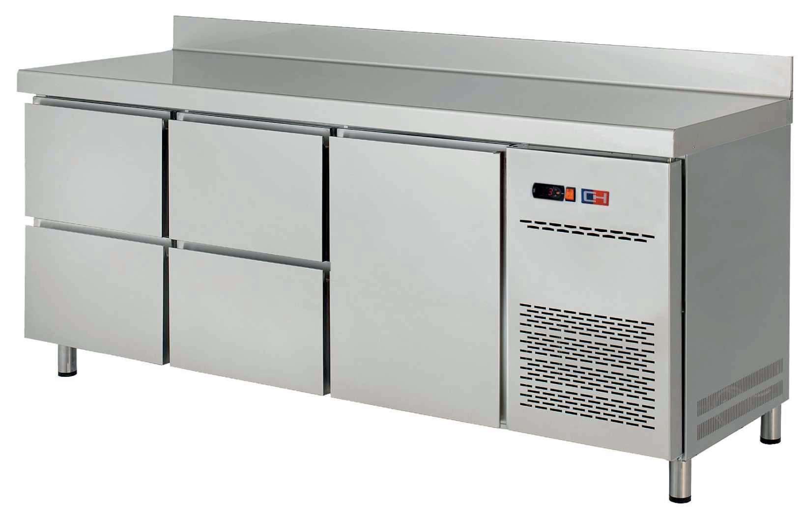 – Gavetas com puxador incorporado em aço inoxidável AISI-304 18/10 com fundo perfurado. Equipadas com corrediças telescópicas com saída suficiente para transpor a superfície de trabalho.
