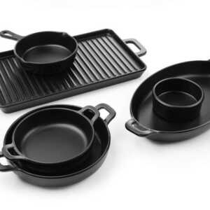 Tabuleiros e taças de apresentação em melamina, em formato de artigos de cozinha.