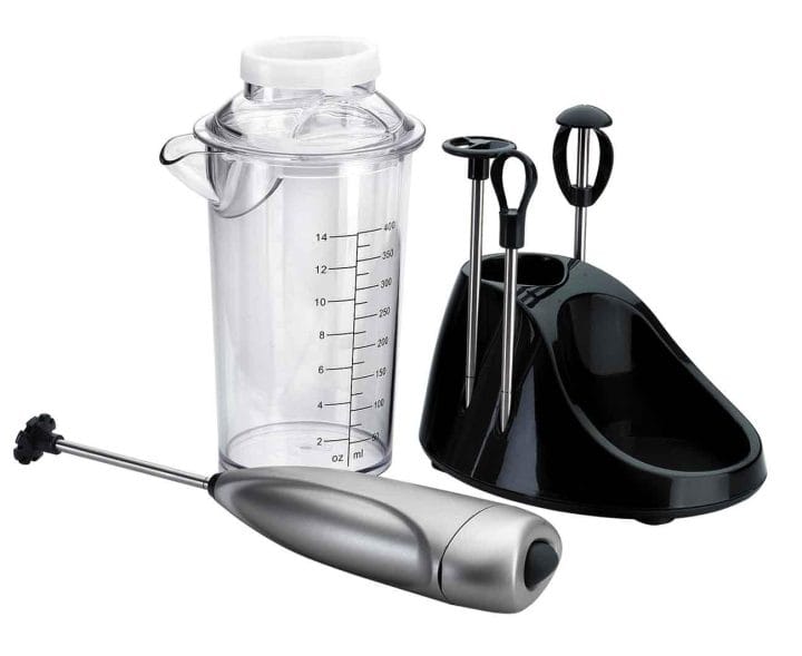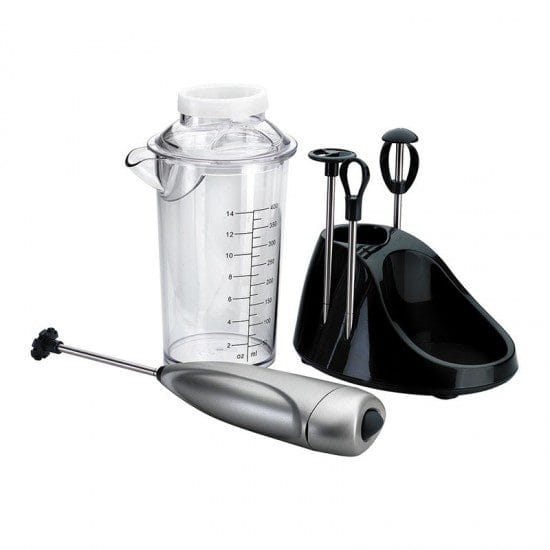 Mixer para café Capuccino com 4 varetas, copo medidor misturador, batedor para pilhas de 2,7 w e base para salvar todas as peças.