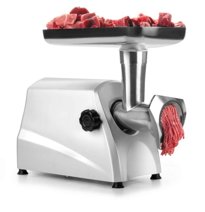Moedor elétrico da carne Profissional com o corpo de alumínio fundido, 3 discos perfurados de aço inoxidável e 4 acessórios extra.