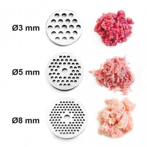 Inclui 3 discos perfurados de aço inoxidável para 3 diferentes tamanhos de carne homogêneos (Ø3-5-8 mm)