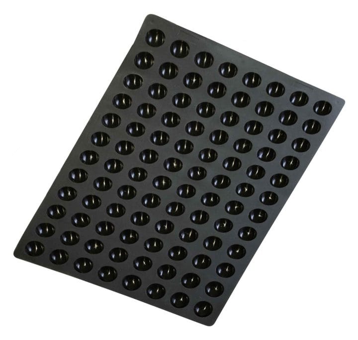 Molde semiesferas para mini bolos com 96 cavidades de Ø35×11,7 mm e 11 ml cada uma fabricado em silicone da série Black.