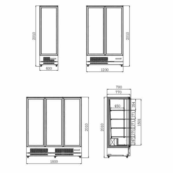 Os nossos armários têm portas com dobradiças triplas de vidro em congelação e vidro duplo em refrigeração, vidro temperado e de baixa emissividade, e portas de fecho automático