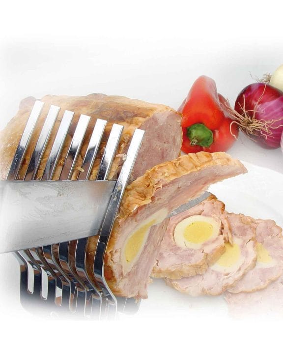 Pente guia para cortar a carne em bifes finos fabricado em aço inoxidável de grande qualidade e resistência à corrosão. Medidas: 11x30x6,5 cm