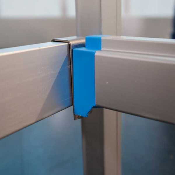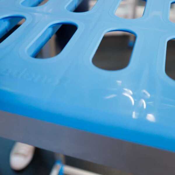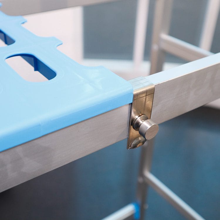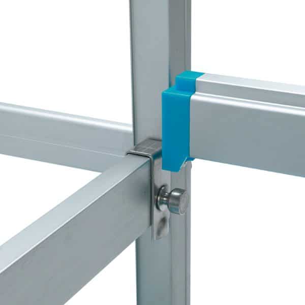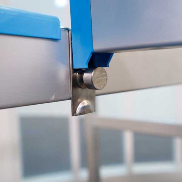 As prateleiras de polietileno são apoiadas no suporte de alumínio por dois bordos, o que lhes confere um posicionamento perfeito e uma maior solidez.