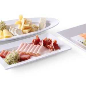 O prato retangular feito de composto de moldagem de melamina é um útil acessório buffet que garante uma excelente apresentação de alimentos prontos a cozinhar.