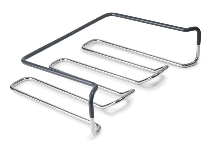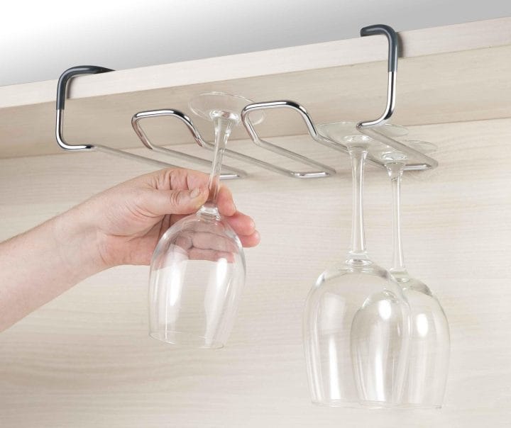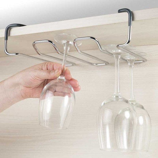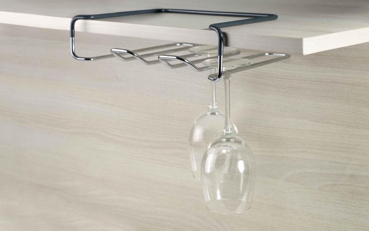 Suporte para 6 copos feito com haste de aço cromado de 6 mm de diâmetro. Adapta-Se a qualquer prateleira ou armário de cozinha ou sala de jantar.