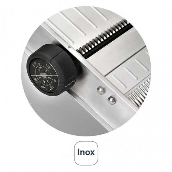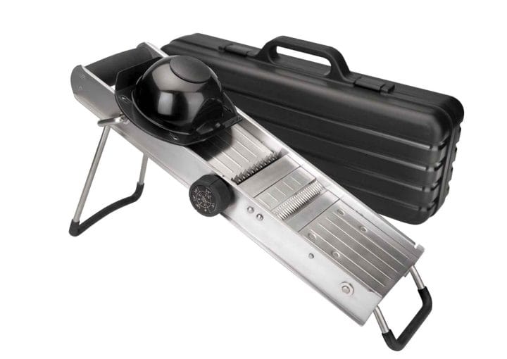 Bandolim profissional, fabricada em aço inoxidável de alta qualidade com lâminas giratórias, regulação de corte e estojo protetor. Medidas: 12,5×50 cm