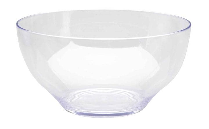 Tigela redonda de 25 cm de diâmetro e 4 litros de capacidade fabricada em plástico acrílico transparente.