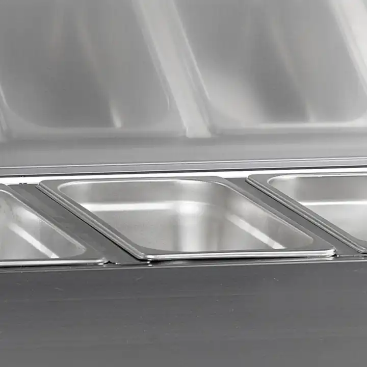 A gama de vitrinas refrigeradas VK-S/S é um excelente complemento para as mesas de frio, permitindo-lhe ter à mão tudo o que necessita para a preparação de alimentos. É compatível com os bandejas GN1/4 e GN1/6 (não incluídos). Esta arca frigorífica é fabricada em aço inoxidável SS304 e possui uma tampa em aço para proteger os alimentos. É ideal para pizzarias, restaurantes de comida rápida e lojas de sandes.
