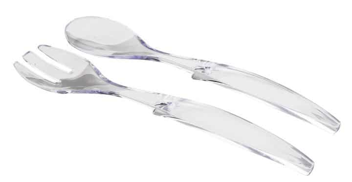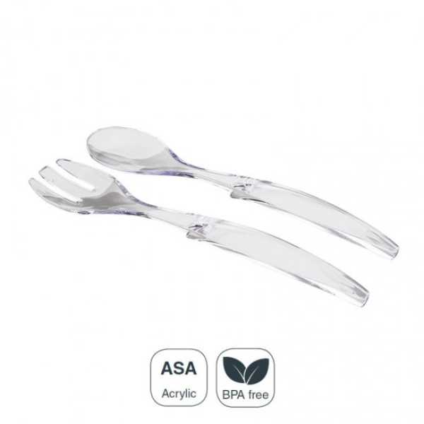 Garfo e colher de 30 cm de comprimento cada peça fabricadas em acrílico transparente, adequado para uso alimentar e livre de bisfenoles.